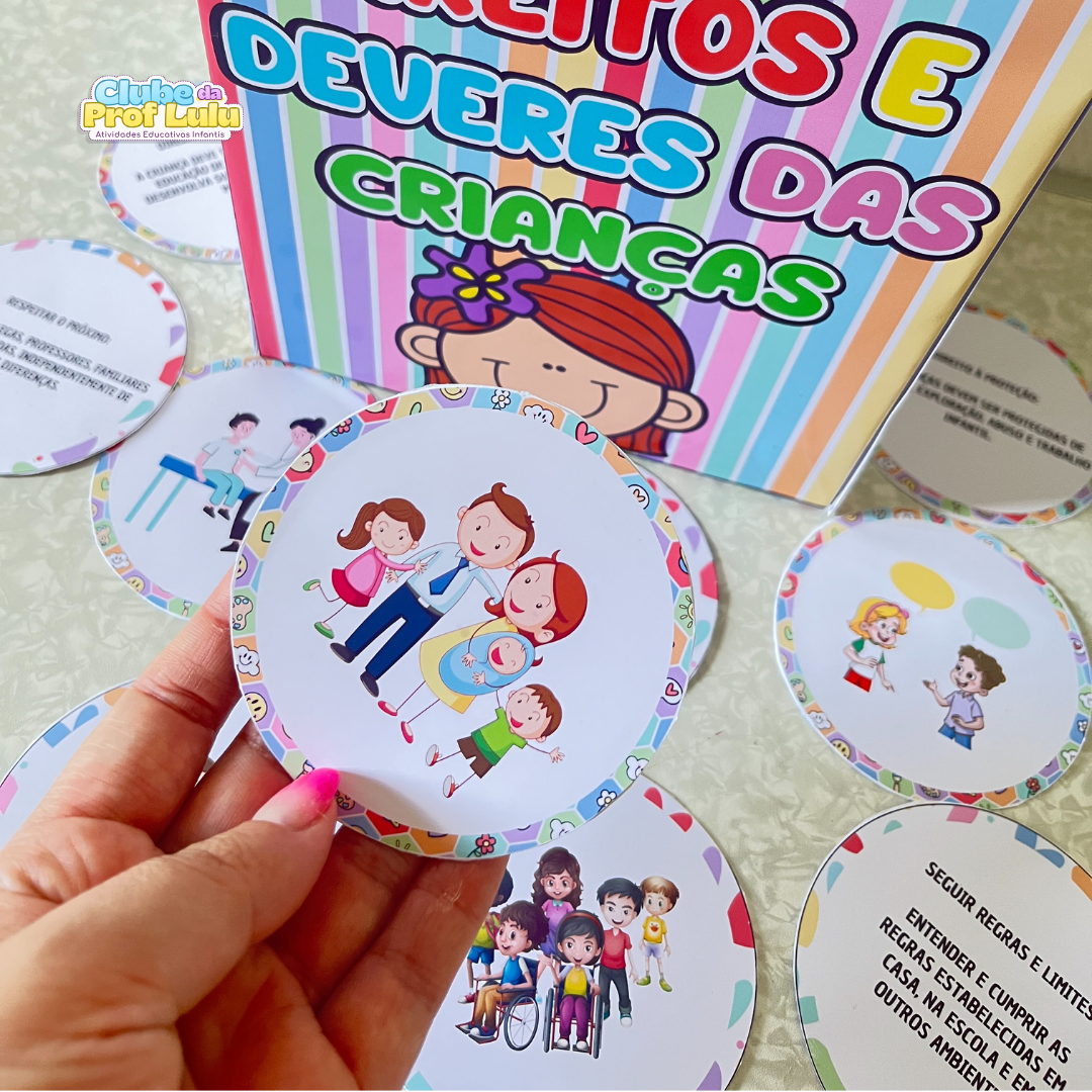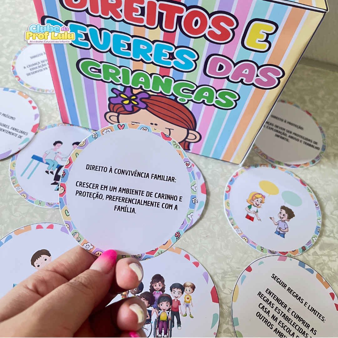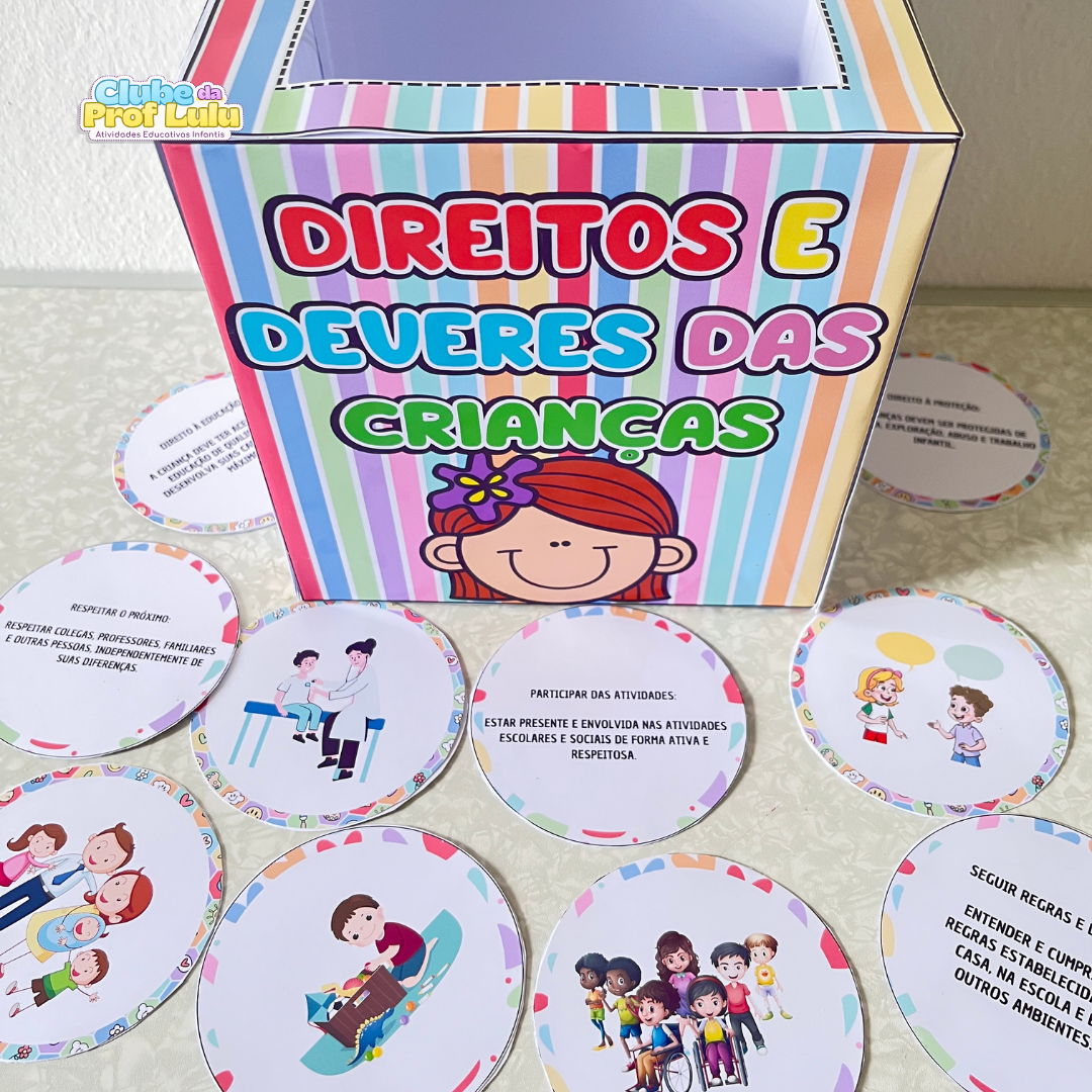 PDF pronto para impressão (11 páginas) que inclui: uma Caixa lúdica “Direitos e Deveres das Crianças” com cards ilustrativos e uma caixa encantadora para ensinar, de forma divertida, os direitos e deveres das crianças, desenvolvendo empatia, consciência social e pensamento crítico; ideal para uso em sala de aula, atividades pedagógicas e projetos educativos.