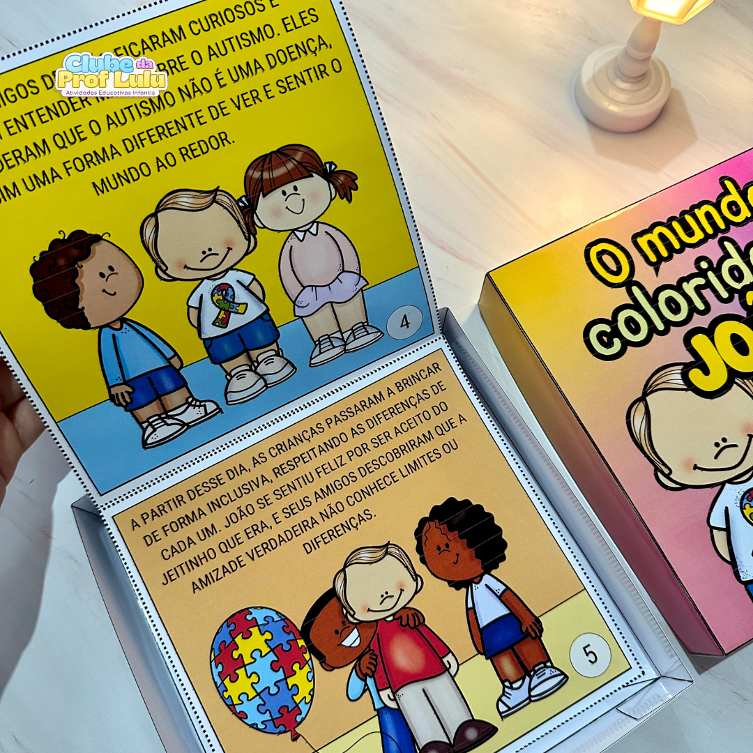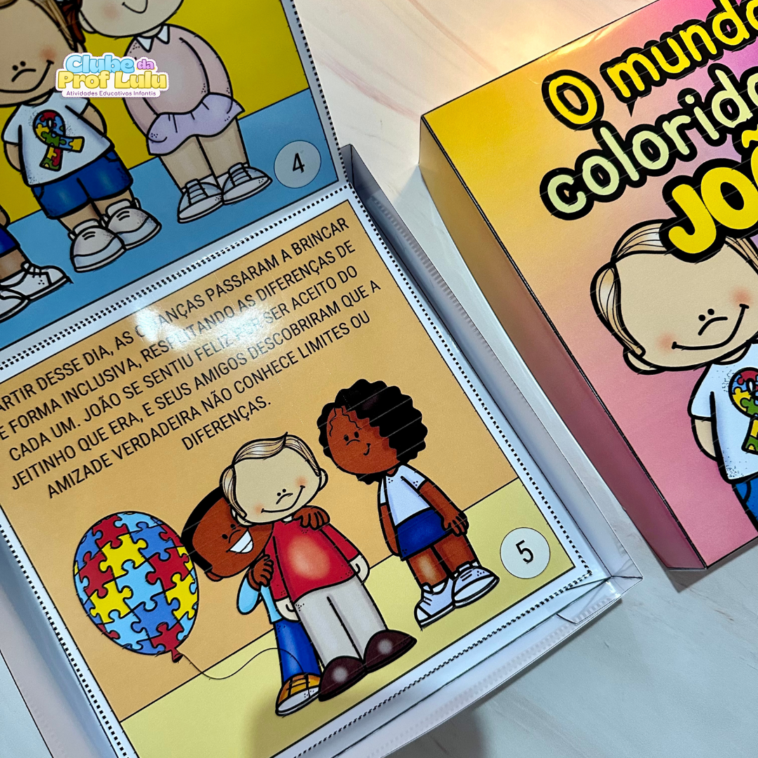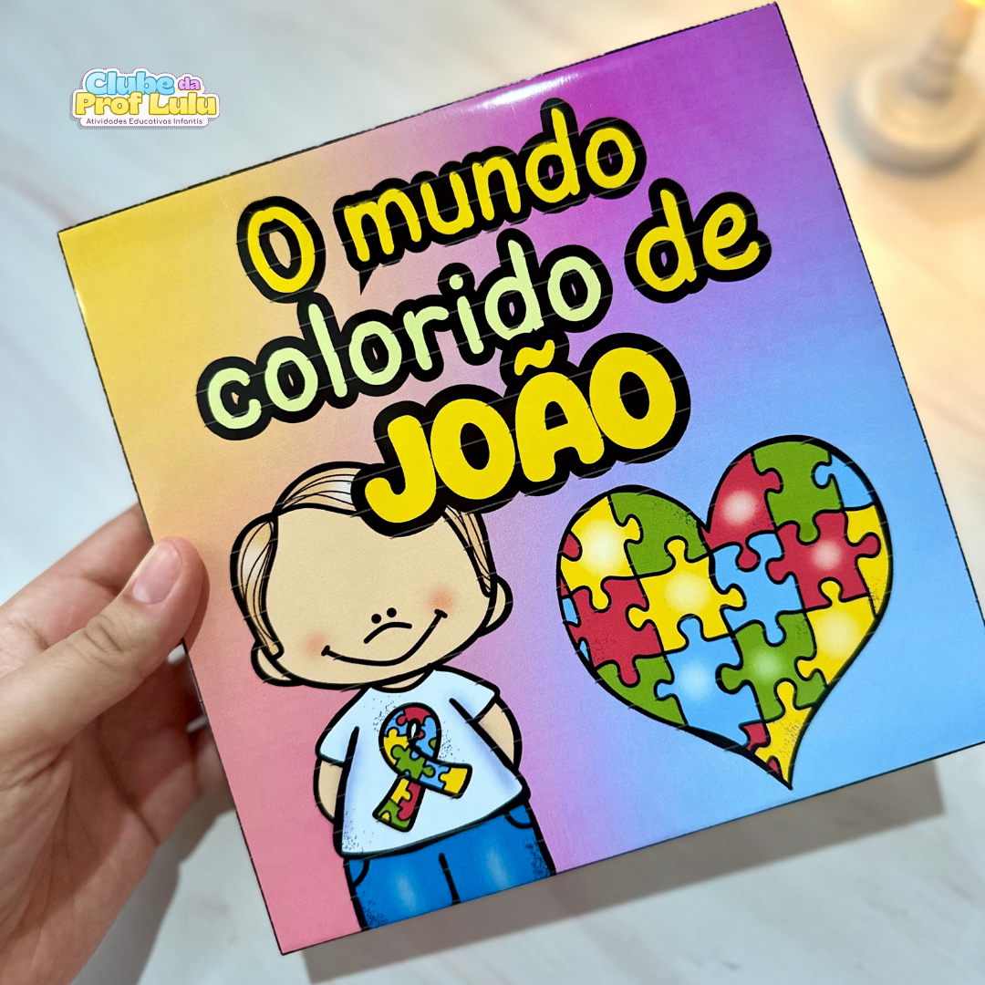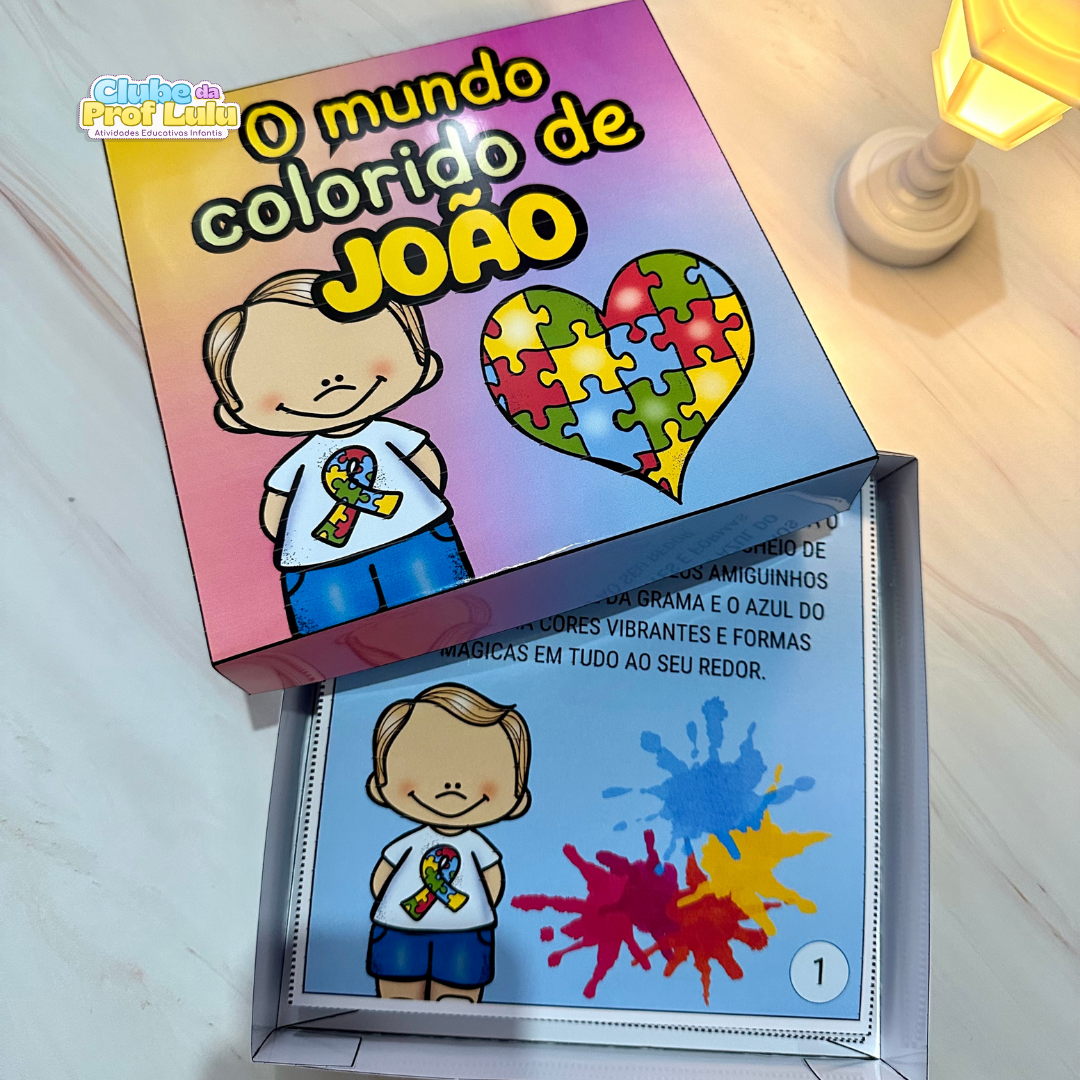 História na caixa para trabalhar o tema Dia Mundial de Conscientização do Autismo com crianças da educação Infantil. A História “O mundo colorido de João” é uma ótima sugestão para falar sobre o tema de forma simples e clara, nos ensinando sobre amor, respeito e empatia e apresentando um pouco sobre o autismo e suas características.