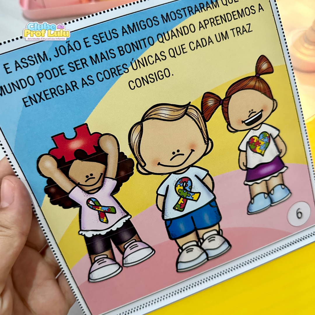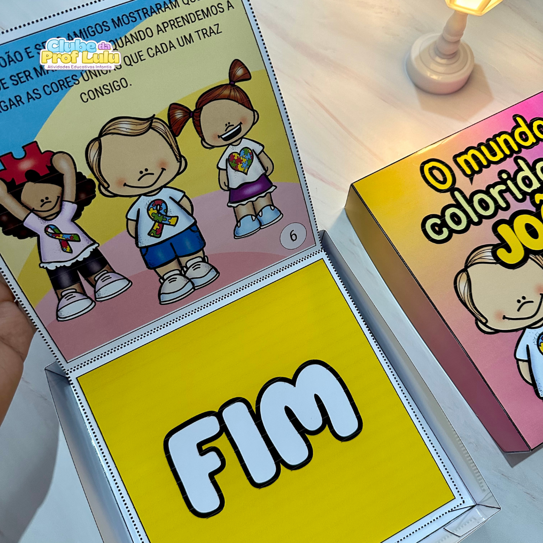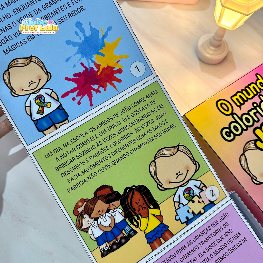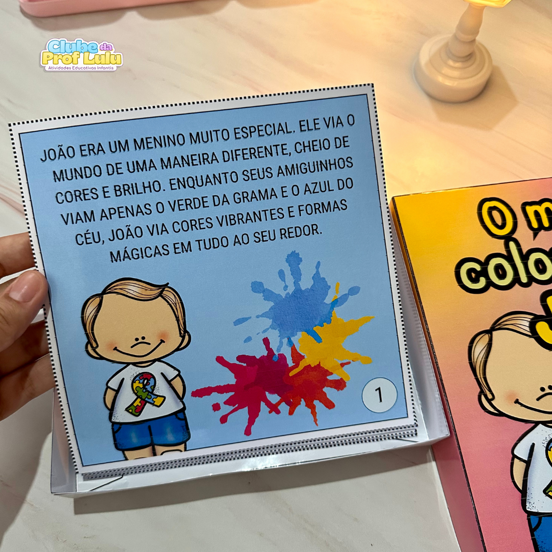 História na caixa para trabalhar o tema Dia Mundial de Conscientização do Autismo com crianças da educação Infantil. A História “O mundo colorido de João” é uma ótima sugestão para falar sobre o tema de forma simples e clara, nos ensinando sobre amor, respeito e empatia e apresentando um pouco sobre o autismo e suas características.