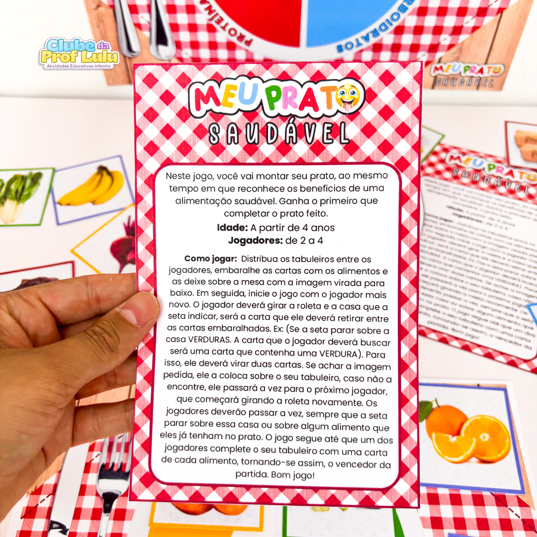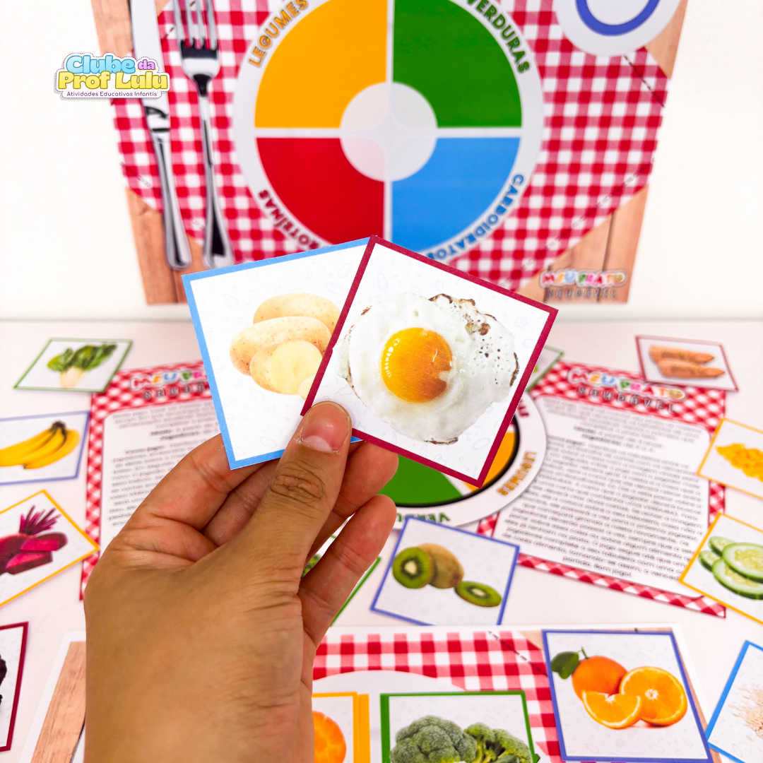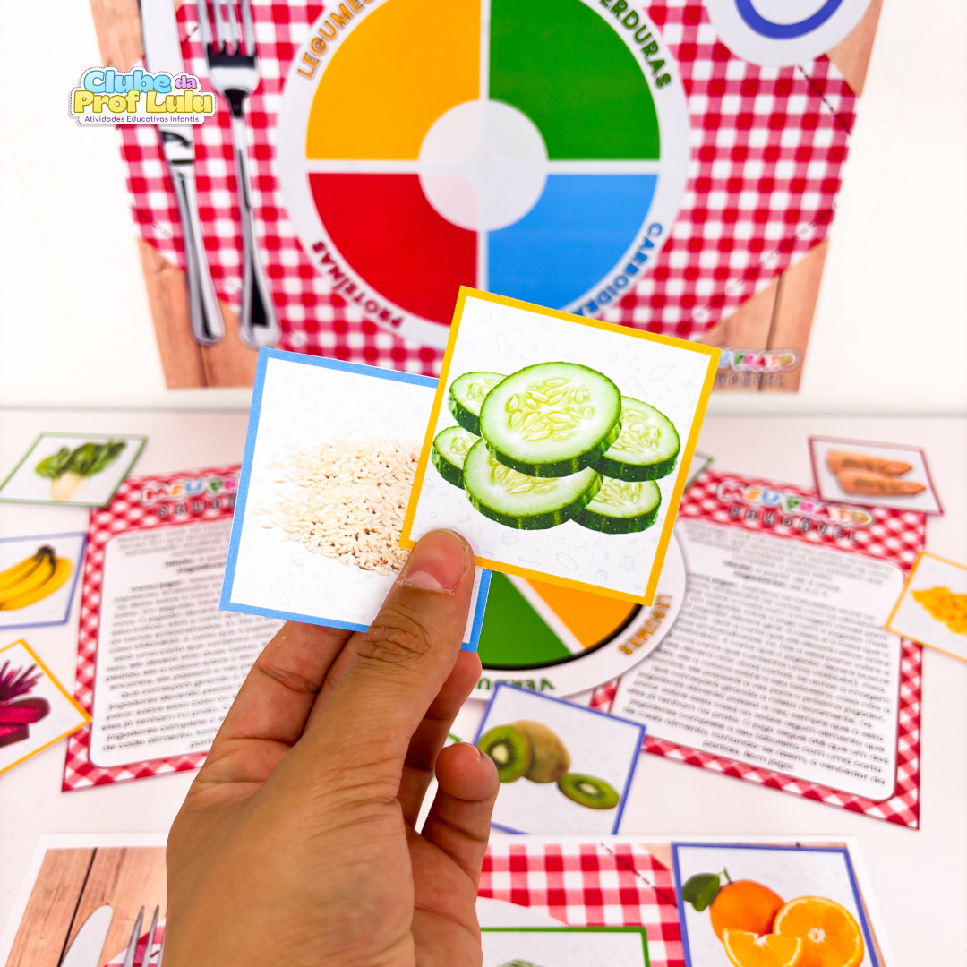 PDF pronto para impressão contendo tabuleiro, roleta, cartas de alimentos e peças para montar o prato; atividades lúdicas para ensinar sobre frutas, verduras, proteínas e alimentação equilibrada, ideal para escolas, professores e famílias (14 páginas). Pode ser aplicado no Dia da Alimentação e outras datas relacionadas.