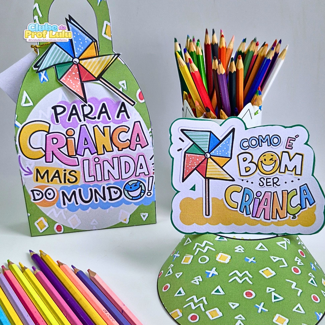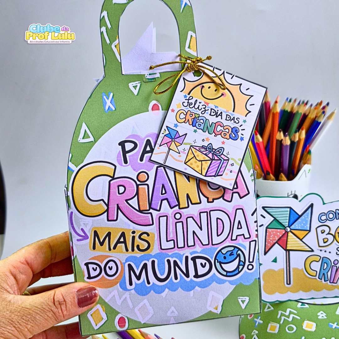 Arquivo PDF pronto para imprimir e montar, com design colorido e divertido, ideal para presentear no Dia das Crianças e para colocar doces, lápis de cor, pequenos brinquedos ou bilhetinhos carinhosos (4 páginas).