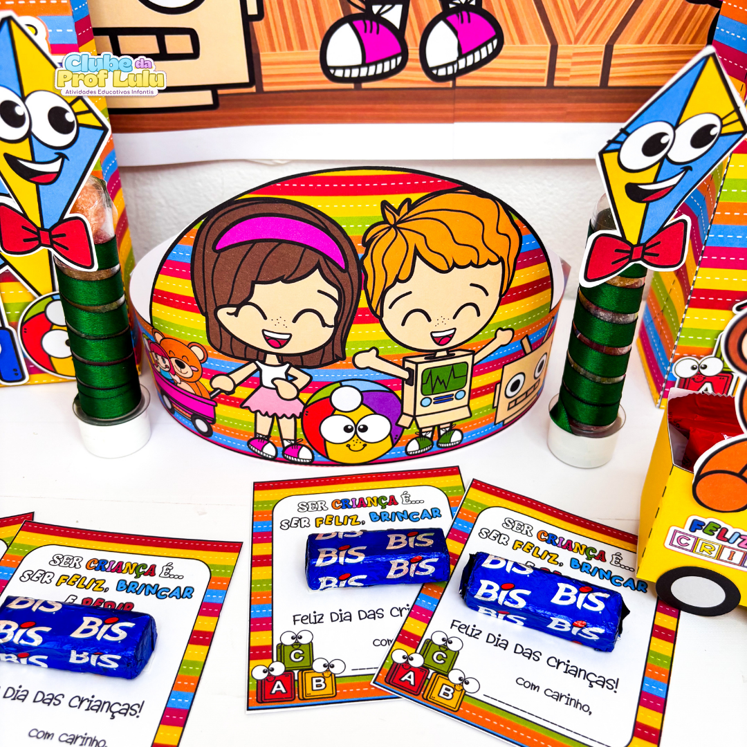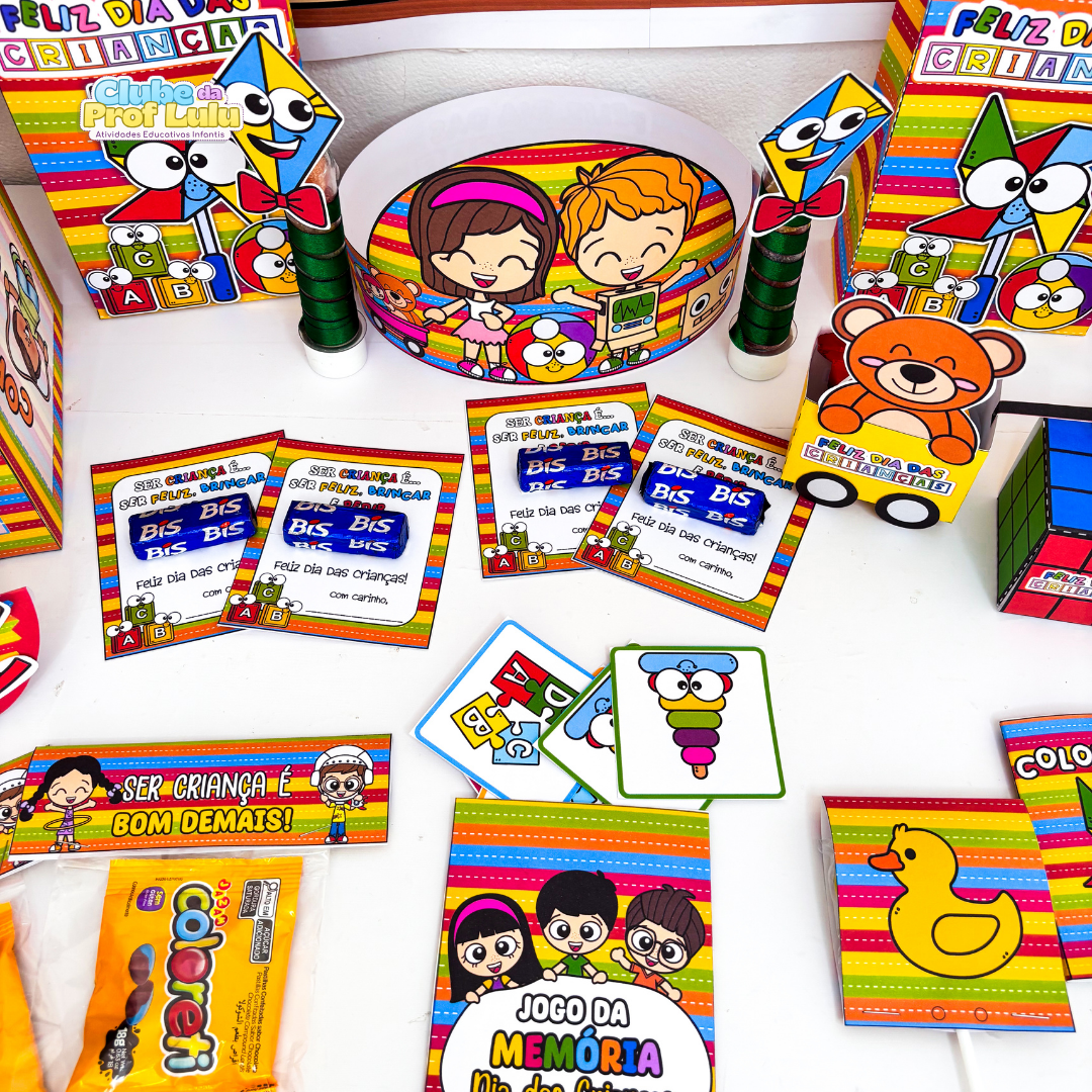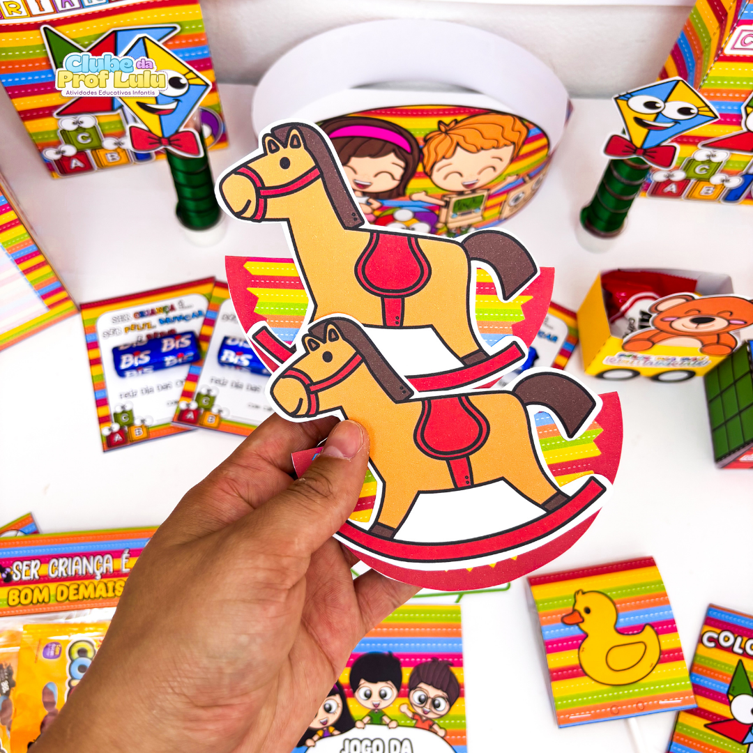 Kit – tema Brinquedos com itens para imprimir e montar: dado das brincadeiras, sacolinha personalizada, coroa colorida, tag pipa para tubete, caixa cata-vento, caixinha cubo mágico, caixinha carrocinha do ursinho, cartão Biz, capa para pirulito, lapela para saquinho, livro zine para colorir, jogo da memória e balancê cavalinho; arquivo digital com 23 páginas.