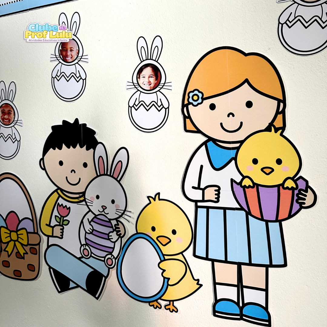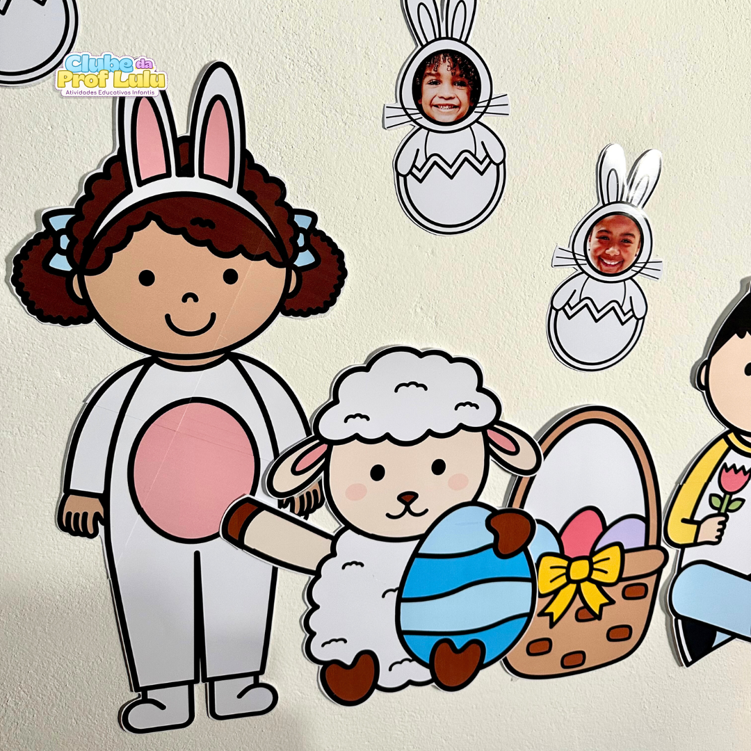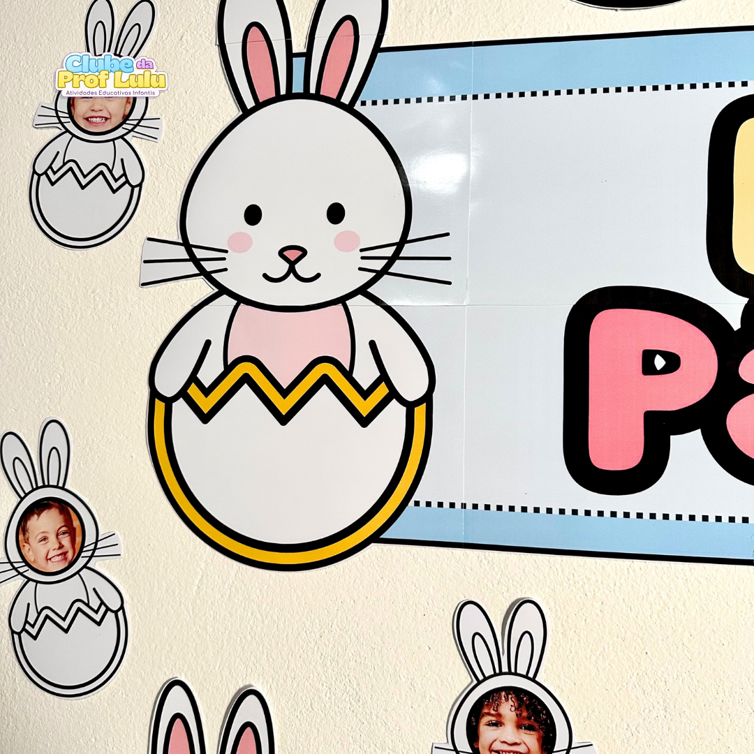 O arquivo também inclui coelhinhos para compor o painel, para a criança colorir, e eles podem ser personalizados com a foto da criança, ou ela pode desenhar o rosto do coelho. No arquivo vai o link de edição