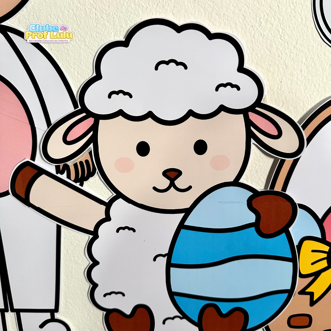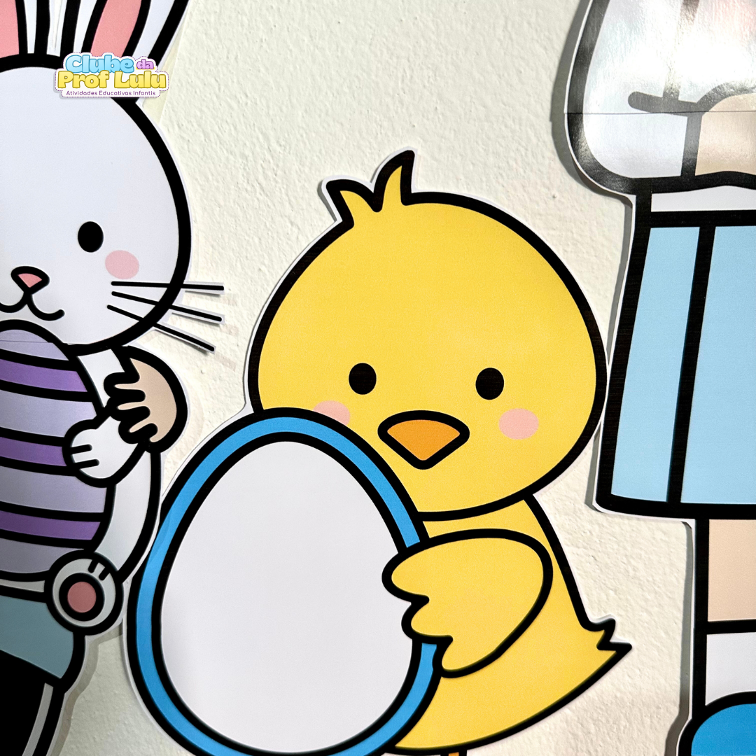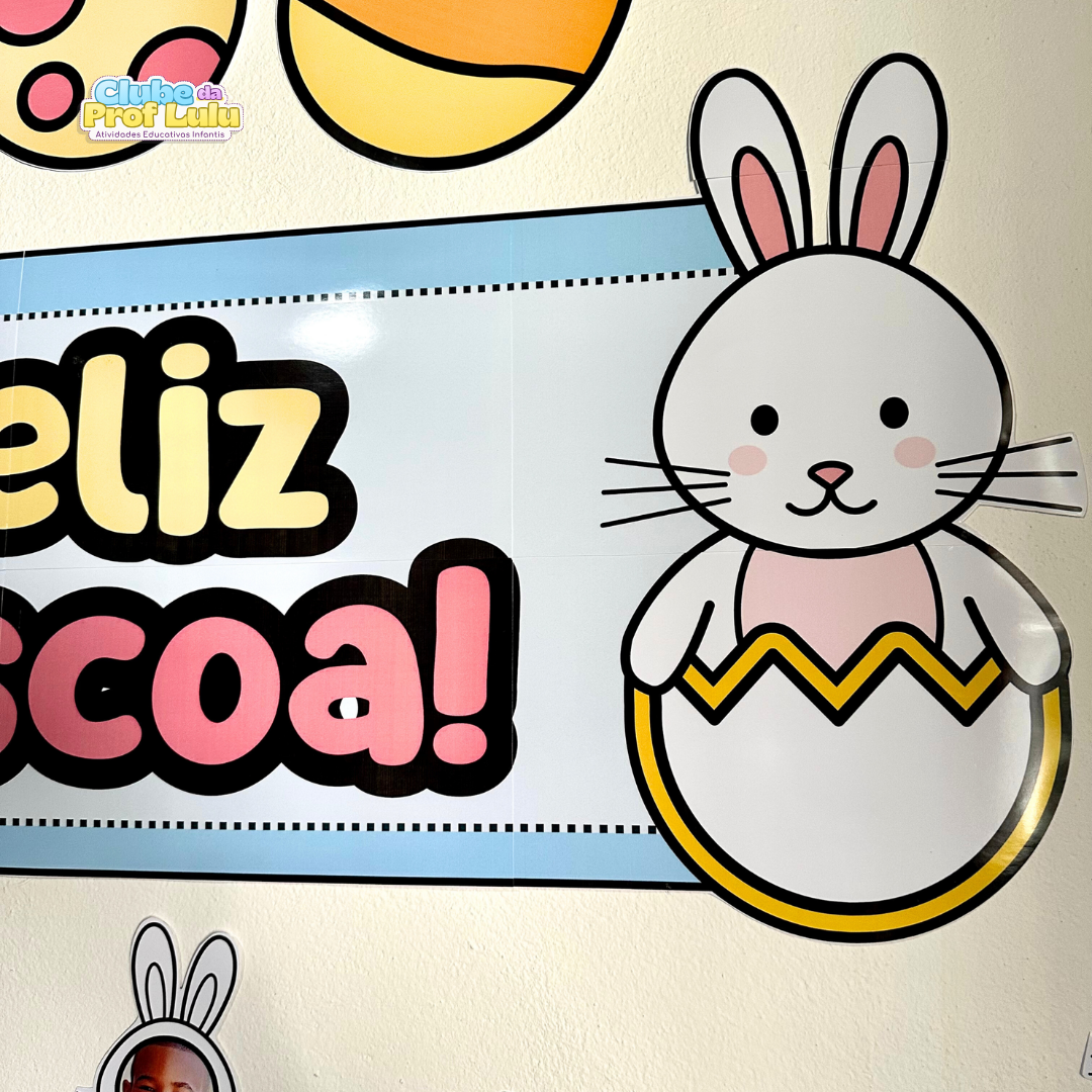 O arquivo também inclui coelhinhos para compor o painel, para a criança colorir, e eles podem ser personalizados com a foto da criança, ou ela pode desenhar o rosto do coelho. No arquivo vai o link de edição